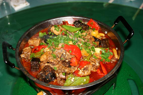【 鳳凰血粑鴨子 】 血粑鴨子是鳳凰最具特色的地方菜之一,制作時將預(yù)先浸泡好的上等糯米裝入碗里,宰殺鴨子時將鴨血溶入糯米浸泡均勻。等鴨血凝固了,再蒸熟,放冷后,將血粑切成一小塊小塊的方塊,然后用菜油煎熟。待鴨肉煮九分熟時,再將血粑放入鴨肉里烹煮,并摻合一定的香料物品,成金黃色即可,鴨子煮血粑既有鴨肉的鮮美味濃,又有血粑的清香糯柔,吃起來口感香濃,食欲大增,真是稀有的人間美味佳肴。