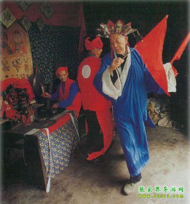 儺戲在湘西土家族地區(qū)也稱儺堂戲、儺神戲,它與土家族原始巫教、巫術(shù)的關(guān)系極為密切。土家族先民信奉的神有儺神、八部大神、土地神等,作為一種宗教活動,這種原始信仰與社會生產(chǎn)活動、文娛活動及民族習(xí)俗是融為一體的,因此儺戲最先的“沖儺還原”帶有明顯迷信色彩,土家族群眾中有“一儺沖百鬼,一愿了千神”的說法,湘西土家族人干脆叫它為“神戲”。湘西土家族儺戲的發(fā)展過程大體是儺、儺舞、儺儀然后才產(chǎn)生儺戲。儺舞源于久遠(yuǎn)的蒙昧?xí)r期,土家先民們在同大自然作斗爭、同毒蟲猛獸作斗爭,便產(chǎn)生了化裝護(hù)面、在鼓樂聲中奔騰呼號、沖殺跳躍的原始儺舞,其所模擬的鳥雀舞、猿猴舞、熊舞等頗為壯觀。儺舞與儺這種驅(qū)鬼消災(zāi)的祭祀儀式結(jié)合后,增加了祈求人獸平安、五谷豐登、緬懷祖先、勸人去惡從善、以及傳播生產(chǎn)知識等內(nèi)容,這就逐漸形成了兼?zhèn)潢U弘教義及娛樂性質(zhì)的祭祀風(fēng)俗歌舞。[2]土家族儺戲就是在此基礎(chǔ)上發(fā)展起來的。部分土家族學(xué)者認(rèn)為土家族儺戲的遠(yuǎn)源可以追溯到戰(zhàn)國時代的《九歌》,《九歌》是土家族儺戲的雛形,他們的依據(jù)是當(dāng)時楚國的沅湘流域,人們“信巫鬼、重淫祀”(《漢書·地理志》),從而使得“陰陽人鬼之間,又或不能無褻慢淫荒之雜”(宋代朱熹《楚辭集注》)。屈原正是加工整理了這一類“鄙陋”之詞,才創(chuàng)作出《九歌》、《天問》等名篇。也有部分學(xué)者不贊同這種論點(diǎn),他們認(rèn)為土家族儺在宋代還停留在儺祭和儺舞階段,最遲到明代,土家族儺才發(fā)展成為儺戲[3]。嘉靖《常德府志》記載:“歲除,歲將盡數(shù)日,鄉(xiāng)村多用巫師,朱裳鬼面,鑼鼓喧舞竟夜,名曰還儺。”文中未點(diǎn)明“儺戲”二字,但卻使用了“還儺”一詞,這與今天民間對儺戲的稱呼相似。又據(jù)清乾隆《永順縣志》載:“永俗酬神,必延辰郡巫師唱演儺戲,……至晚,演儺戲。敲鑼擊鼓,人各紙面一,有女裝者,曰孟姜女;男扮者,曰范七郎。”在土家族儺戲中,孟姜女傳說故事占著非常重要的地位。在湘西土家族地區(qū),儺戲一般有二十四正戲,即二十四戲神。每次儺儀結(jié)束時,巫師要用香火在黃裱紙上燒二十四個洞,以表示奠祭二十四戲神。民間有諺語:“儺神菩薩不識字,只要二十四個圈圈滿。”在二十四儺神中,被稱為勾愿神的姜女、范郎是還儺愿時非常重要的兩位神靈。在儺戲中,《孟姜女》是整場的高潮,平時,儺戲唱完后,由沒下裝的孟姜女、范郎去向主人家及觀眾“拜臺”,以示“了愿”。清代中期以后,儺戲吸取了花燈、陽戲、高腔等其他地方戲劇劇種的唱腔和劇目,逐漸變得日益成熟。我們仔細(xì)查看了全國371個劇種,發(fā)現(xiàn)儺戲、花燈戲有著相同的班社,也就是說一個演出班社可以演出儺戲、花燈戲兩個劇種。這段時期,儺戲已作為獨(dú)立戲劇劇種參加演出。由于儺戲是由巫儺法事演變而成的戲劇形式,經(jīng)歷著巫儺法事(驅(qū)鬼祭祀)、儺壇上戲和儺堂正戲的發(fā)展過程。