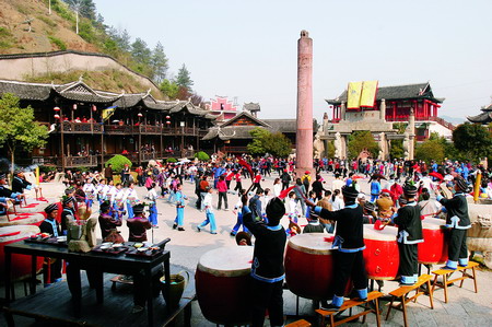 擺手舞是土家族最有影響的大型舞蹈,帶有濃烈 的祭祀色彩。歌隨舞而生,舞隨歌得名。擺手舞產生 于遠古時代,明清時期尤其盛行。清雍正《永順府志》 載:“每歲正月初三至十七日,男女齊集,鳴鑼擊鼓, 跳舞唱歌,名曰擺手”。 擺手舞又名“社巴”。整個活動民祭曲舞蹈、唱 歌等為表演形式,以講述人類起源、民族遷徙、英雄 事跡為內容。祭祀儀式畢,由“梯瑪”或掌壇師帶領 眾人,進擺手堂或擺手坪跳擺手舞,唱擺手歌。《后 漢書》稱擺手舞為《巴渝擺》;《晉書·樂志》認為 舞曲四篇中就有“予渝”、“弩渝”是離不開武器的 ,故為一種古代戰(zhàn)舞。土人作戰(zhàn)前跳此舞以助長士氣 。 擺手舞分單擺、雙擺、大擺手、小擺手數(shù)種。跳 擺手舞擊大鼓、鳴大鑼、氣勢宏渾壯闊,動人心魂。 舞蹈時手腳呈同邊動作,踢踏擺手,翩躚進退,成雙 成對,意境生動。 擺手舞不僅是民間一種娛樂和健身性質的體育活 動,亦是舞臺上獨樹一幟的藝術奇葩,正是:“擺手 堂前艷會多,攜手聯(lián)袂緩行歌。鼓鑼聲雜喃喃語,裊 裊余音嗬囈嗬。”