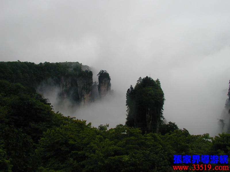這里,我還給大家講個奇異現(xiàn)象。1991年4月的一天下午,雨過天晴,整個天子山漫開一片朦朦朧朧的薄霧,從西海到神堂灣一帶,一座座巖峰在霧中時隱時現(xiàn)。一群上海游客來到點將臺,忽然,一幅奇異的場景把大家驚呆了:神堂灣中央,七位少女從云霧中飄落到一座巖峰峰頂?shù)钠脚_上,飲茶、撫琴,翩翩起舞達(dá)40分鐘之久。游客們起初以為是一種幻覺,揉揉眼睛再看,仍然是三綠四紅,長發(fā)披肩,體態(tài)婀娜,舞步輕盈。直到“仙女們”隨一片云霧漸漸隱去的前一秒鐘,大家仍然不敢弄出半點聲響,有相機的就拼命按快門。遺憾的是距離太遠(yuǎn)了,當(dāng)晚將膠卷取去沖洗,什么也沒留下。消息傳開后,有人相信,有人不相信。其實,神話也好,事實也好。這種奇異現(xiàn)象完全可用科學(xué)去解釋。“海市蜃樓”這是人所共知的;而大沙漠中不也經(jīng)常出現(xiàn)綠洲、村莊、城市么?