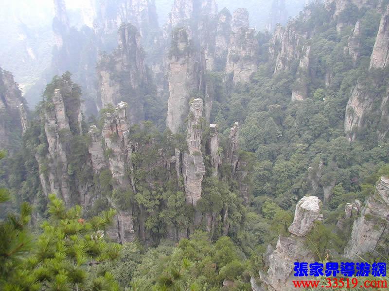 (大觀臺)這就是大觀臺。極目遠(yuǎn)眺,千百座奇峰盡收眼底。一位詩人說,武陵源的砂巖峰林是一步一觀景,千步千造型,一山有四季,十步不同天。專家測算出武陵源石峰有3103座。一如一位高超的雕塑大師,模擬宇宙萬物,無不形狀逼真,維妙維肖,栩栩如生,呼之欲動。有的如海螺出水,有的如金龜銜日,有的如蓮花盛開,有的如天橋橫空,有的如長槍刺天,有的如寶塔聳立,有的如老人采藥,有的如玉女梳妝,有的如將軍出征,有的如戰(zhàn)馬長嘯,有的如情人幽會,有的如夫妻相擁,有的如仙女散花,有的如村姑守望.....有的孤峰獨秀,有的直插云霄,有的婷婷玉立,有的威武勇猛,有的小巧玲瓏,有的大氣磅礴。進(jìn)入武陵源,但見一片峰的森林,峰的世界,峰的海洋。挺拔、奇秀、集中、原始、粗獷、古野。這就是武陵源。一位藝術(shù)大師說:武陵源的山峰,改寫了山的概念。大攝影家陳勃說:“三山五岳堪比美,華夏風(fēng)光每一流。”王繼杰先生說:“武陵源上三日游,勝讀千篇李杜詩。”許世杰先生說:“秀幽險峻稱奇絕,五岳黃山拜下風(fēng)。”李成瑞先生為此大抱不平:“神州勝景誰為最?須請霞公重評勘。”可惜徐霞客無緣到大觀臺來,也不可能為武陵源作甚評價了。