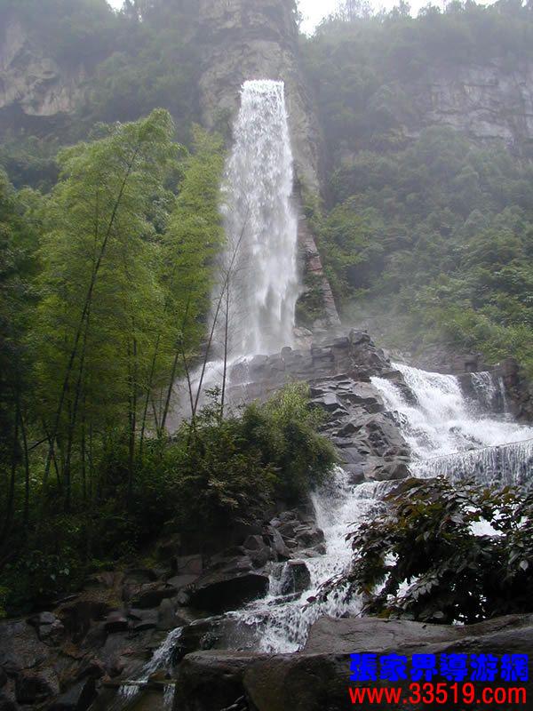 (聽瀑樓)朋友們,寶峰湖游結束了,大家一路辛苦了。現在,我提議到“聽瀑樓”歇歇腳,洗洗汗,聽聽音樂,養(yǎng)好精神再趕路。你們看這民族式建筑,背依砂巖石峰,面朝寶峰飛瀑,登斯樓也,品土家之香茶,聽瀑布之濤聲,此情此景,怎不令人感嘆人與自然傾心交談的空靈境界?