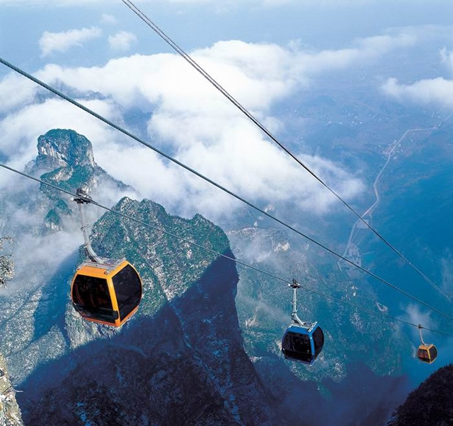 天門索道:索道線路斜長7455米,上、下站水平高差1279米,是世界最長的單線循環(huán)脫掛抱索器車廂式索道,猶如一道彩虹飛渡“人間” “天上”,又像一條巨龍騰翔素云蒼穹,依山籍壁,拔地沖天,蕩氣回腸,恢宏壯觀,成為天門山旅游風景區(qū)“四大奇觀”之一。