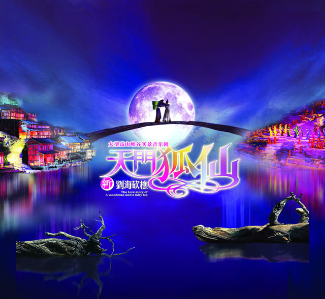 《天門狐仙——新劉海砍樵》目前是世界第一臺有完整故事情節(jié)的山水實景音樂歌舞劇。舞臺選址在天門山風景區(qū)山門口內(nèi)至天門山頂?shù)恼麠l峽谷,總投資達到1.2億元,演員隊伍達530多人。主舞臺以10000平米的玻璃鋼打造,是目前世界最大的全景玻璃鋼舞臺。音樂主創(chuàng):譚盾。
