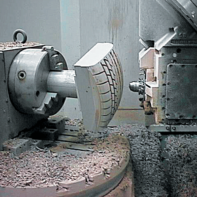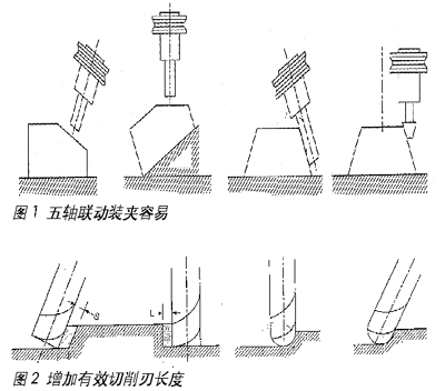 由于使用五軸聯(lián)動機(jī)床,使得工件的裝夾變得容易(圖1)。加工時(shí)無需特殊夾具,降低了夾具的成本,避免了多次裝夾,提高模具加工精度。采用五軸技術(shù)加工模具可以減少夾具的使用數(shù)量。另外,由于五軸聯(lián)動機(jī)床可在加工中省去許多特殊刀具,所以降低了刀具成本。五軸聯(lián)動機(jī)床在加工中能增加刀具的有效切削刃長度,減小切削力(圖2),提高刀具使用壽命,降低成本。