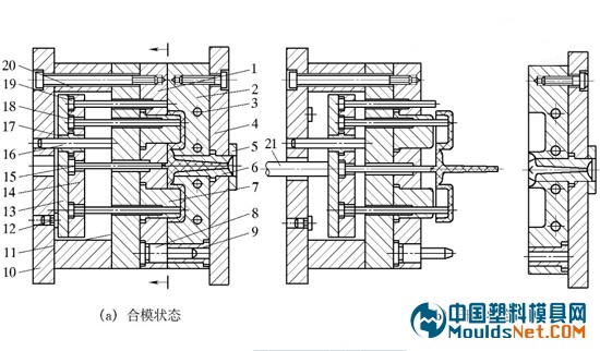 19—復(fù)位桿;20—墊板;21—注射機頂桿