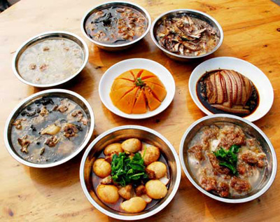 如果說靖港的吃名聞遐邇,有口皆碑,那么,八大碗則是靖港吃之翹楚,也是古鎮(zhèn)人引以為榮的傳統(tǒng)名牌。從前靖港街上數(shù)十家有名餐館,都把八大碗當(dāng)作各自的招牌菜,各餐館的廚師也都是潛心研習(xí),精益求精,把烹制出高水平的八大碗當(dāng)作看家本領(lǐng)。曾經(jīng)繁榮昌盛的“小漢口”靖港,那些停船上岸的船夫,載貨而來的生意人以及慕名而來的浪人,首先就得進餐館吃八大碗,飽其饞吻,享其口福,乃至為了貪吃八大碗而“船到靖港口,順風(fēng)也不走。”而靖港街上的紅白喜事,也是非八大碗不成宴席。