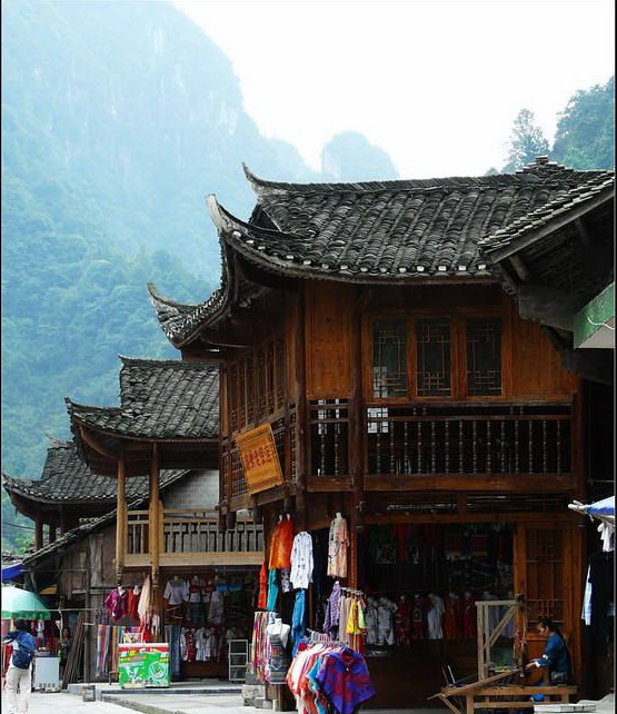 村寨四周山勢雄奇,絕壁夾天;“夯峽”、“九龍”、“玉泉”三溪在這里相會,如同三根彩帶在這里相交結(jié)。這里是風(fēng)景區(qū)的中心,一萬五千多米長的青石板路從這里一直通向各個景點這里還是一個角度十分好的觀景臺,人立于此,只要原地轉(zhuǎn)動身子,就可觀賞到東西南北全方位的各個景點,那含情脈脈的“相依巖”、昂首奮蹄的“駟馬峰”、惟妙惟肖的“孔雀開屏”五彩繽紛的“彩云壁”和“畫屏峰”……盡在眼中無不景象萬千,令人目不瑕接。詩人石元機贊曰: