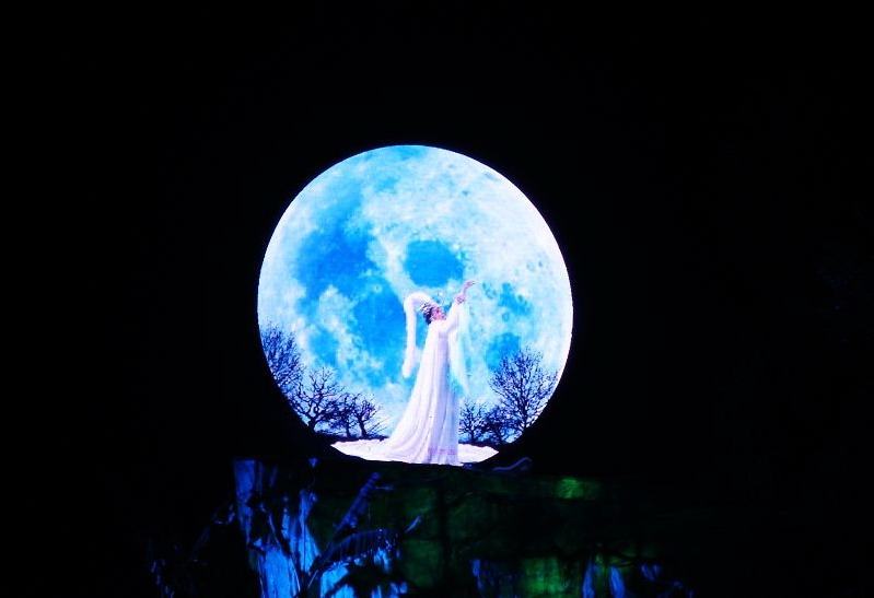 本項目舞臺及舞美設(shè)施為目前世界范圍內(nèi)的實景演出中投資最多、舞臺機械裝置最為復(fù)雜且規(guī)模最大、燈光設(shè)施數(shù)量最多且分布范圍最大的,另外主舞臺也是世界最大的全景玻璃鋼舞臺(10000平方米)。舞臺機械設(shè)施中,尤其是跨度60米、高度32米的伸縮飛橋,是目前世界范圍的演出項目中絕無僅有的大型舞臺機械裝置。燈光數(shù)量:大型燈光1100盞,中小型燈光2800盞;演出音響為專門定制的美國EAW音戶外防雨、防潮音響設(shè)備,也是目前國內(nèi)演出項目中投資最大的。