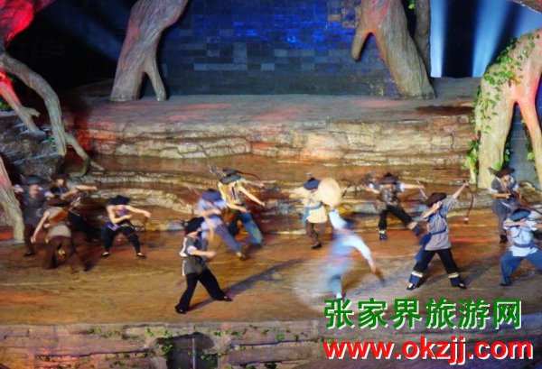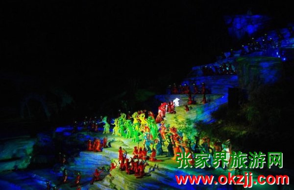 是目前世界第一臺有完整故事情節(jié)的山水實景音樂歌舞劇。舞臺選址在天門山風(fēng)景區(qū)山門口內(nèi)至天門山頂?shù)恼麠l峽谷,總投資達到1.2億元,演員隊伍達530多人。主舞臺以10000平米的玻璃鋼打造,是目前世界最大的全景玻璃鋼舞臺。