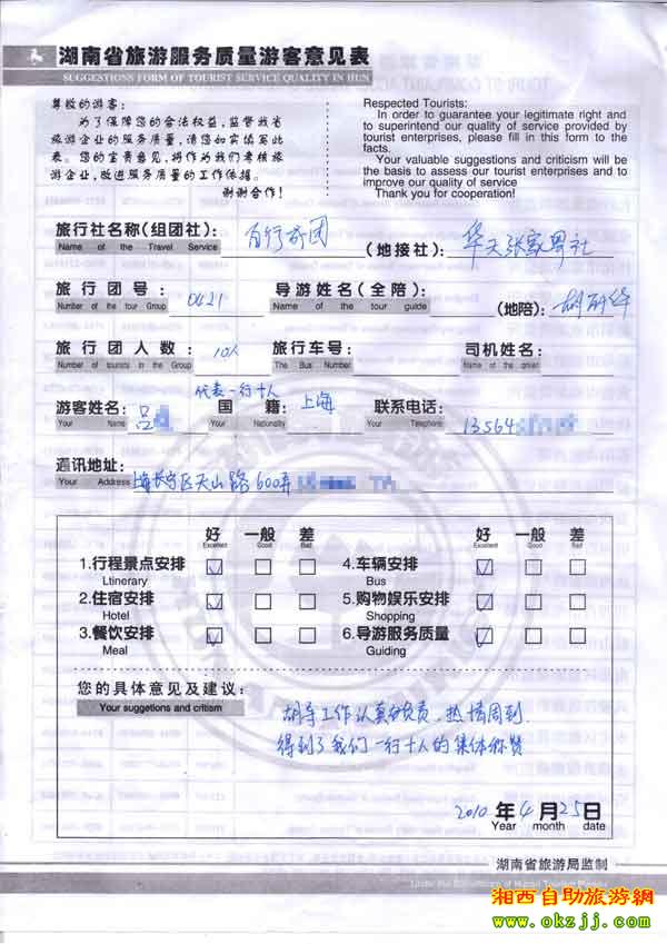 2010年4月21號(hào)上海呂小姐10位張家界鳳凰旅游質(zhì)量反饋