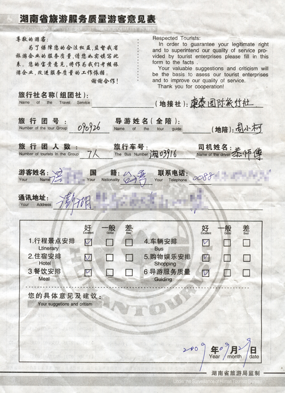 9月26日臺灣李洪先生一行7人接待質(zhì)量反饋單: