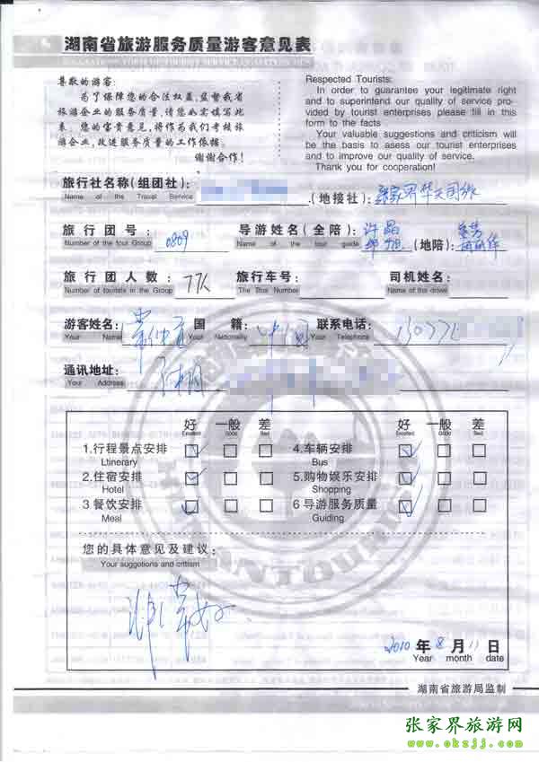 2010年8月11日岳陽常先生一行77位旅游質量反饋