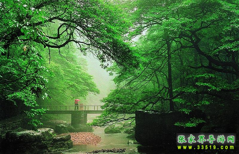沿著金鞭溪往上游走,兩邊是高聳挺拔的巖峰,淙淙的流水一直陪伴著你,雨后的空氣如同滌洗過一般,夾帶著那種山里特有的香草味清新而又甜美,不時(shí)飄灑過來一陣細(xì)雨露水,真使人舒服極了。走不多遠(yuǎn)就是美麗恬靜的“紫草潭”,來自金鞭溪與砂刀溝的兩條溪水在這里匯合,一起向東流去。墨綠的溪水流在紅色的沙巖上,煞是好看。這里有低瀑,有淺灘;成片的銀花飛濺,碎作千杯瑞雪。潭上一棵函大的楠木,如一把巨傘覆蓋在潭上的石板橋上,顯得那么清涼而悠閑。